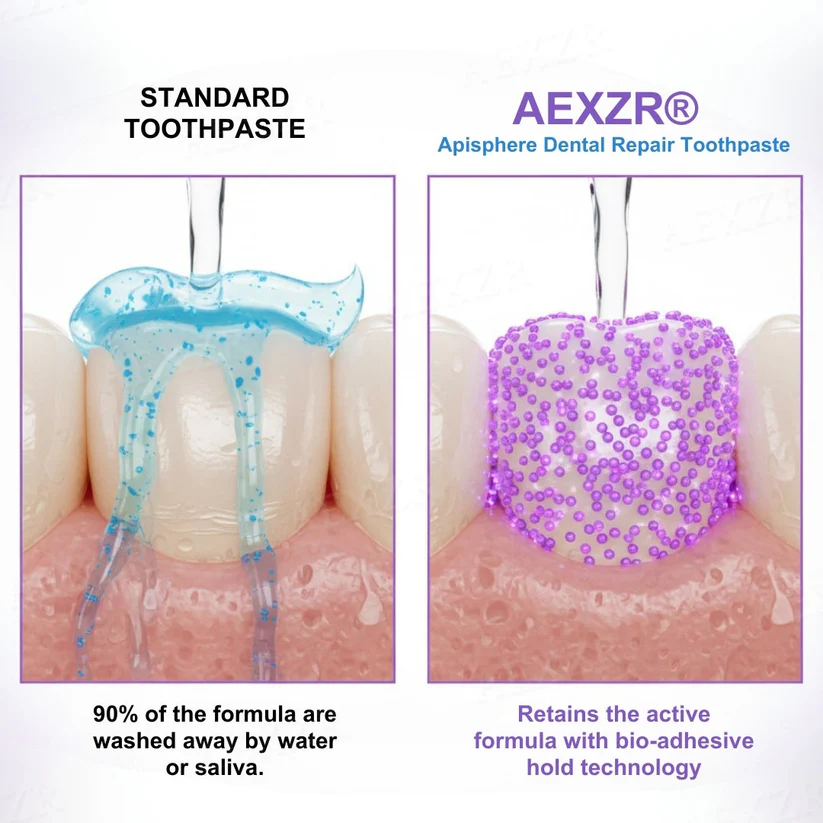 Standard formulas rinse off quickly, limiting how long ingredients stay on the enamel. AEXZR® Apisphere uses a bio-adhesive liposomal base designed to stay in place longer during brushing, supporting: