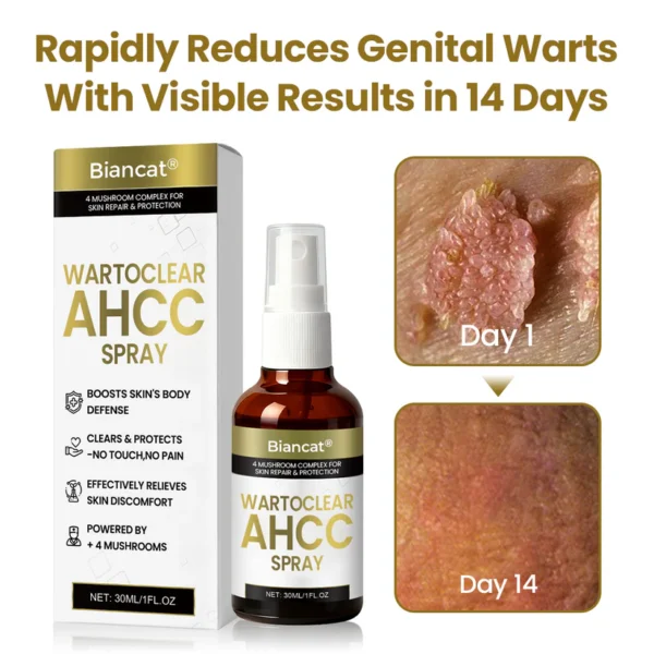 Biancat® WartoClear AHCC Spray is different. Its innovative formula contains four medicinal mushrooms and AHCC (Active Hexose Correlated Compound) to penetrate deeper, targeting both visible warts and the viral root. This supports your immune system to fight the HPV virus effectively, helping prevent recurrence.