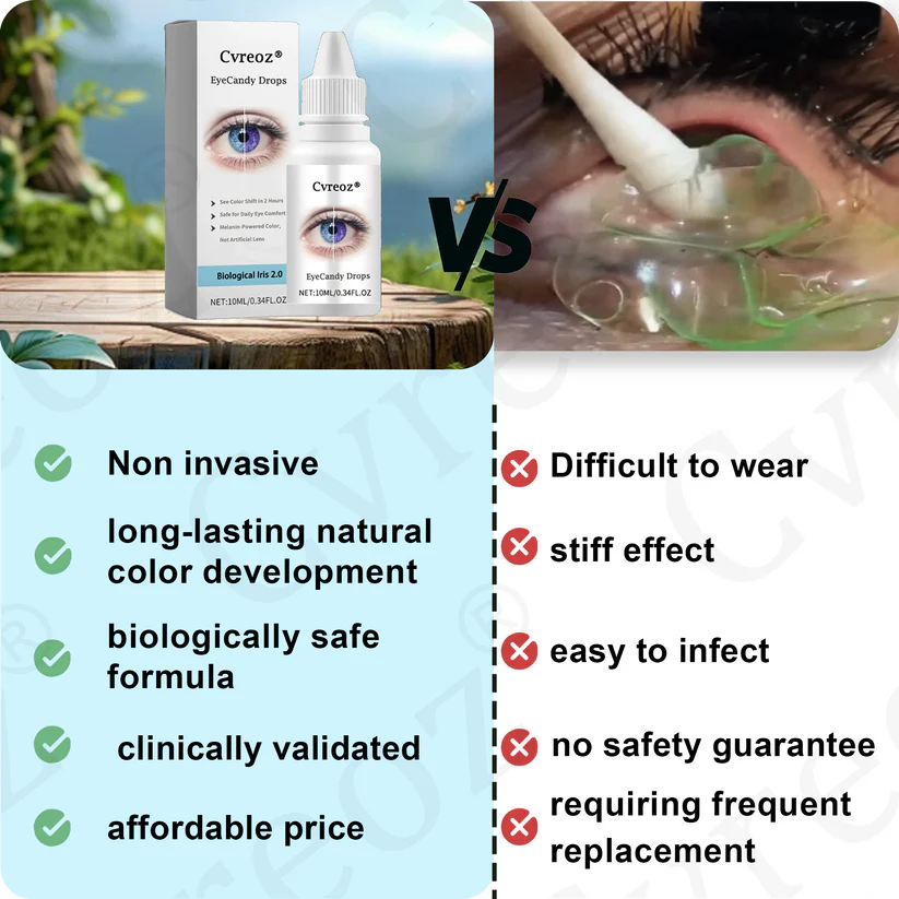 Tired of dry, irritated eyes from color contacts? 👁️ Cvreoz® EyeCandy Drops offer the perfect solution! Unlike traditional lenses that cause discomfort, redness, and infection risks, our innovative drops safely enhance your natural eye color in just 2 hours – with no dryness, no fake-looking edges, and no daily hassle. The vegan formula lasts 5-7 days, giving you gorgeous, natural-looking color without the dangers of contacts. Plus, you’ll save hundreds compared to buying multiple pairs of lenses. Ditch the discomfort and embrace effortless beauty – your eyes will thank you! ✨