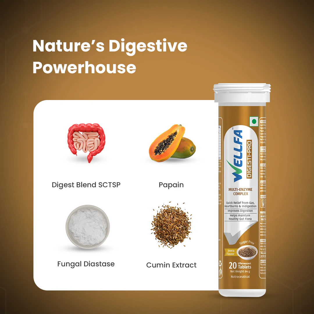 Are you tired of the heavy, uncomfortable feeling after your favorite meals? WELLFA Digesti-Pro is engineered to turn water into a powerful digestive elixir. Using a proprietary enzyme blend, these delicious effervescent tablets help break down carbohydrates, fats, and proteins into easily absorbable nutrients instantly. Unlike traditional pills that take time to digest, Digesti-Pro starts working the moment you take your first sip. Backed by over 5 decades of expertise and free from artificial flavors or preservatives, it’s the cleanest and most effective way to ensure your gut health remains at its peak.