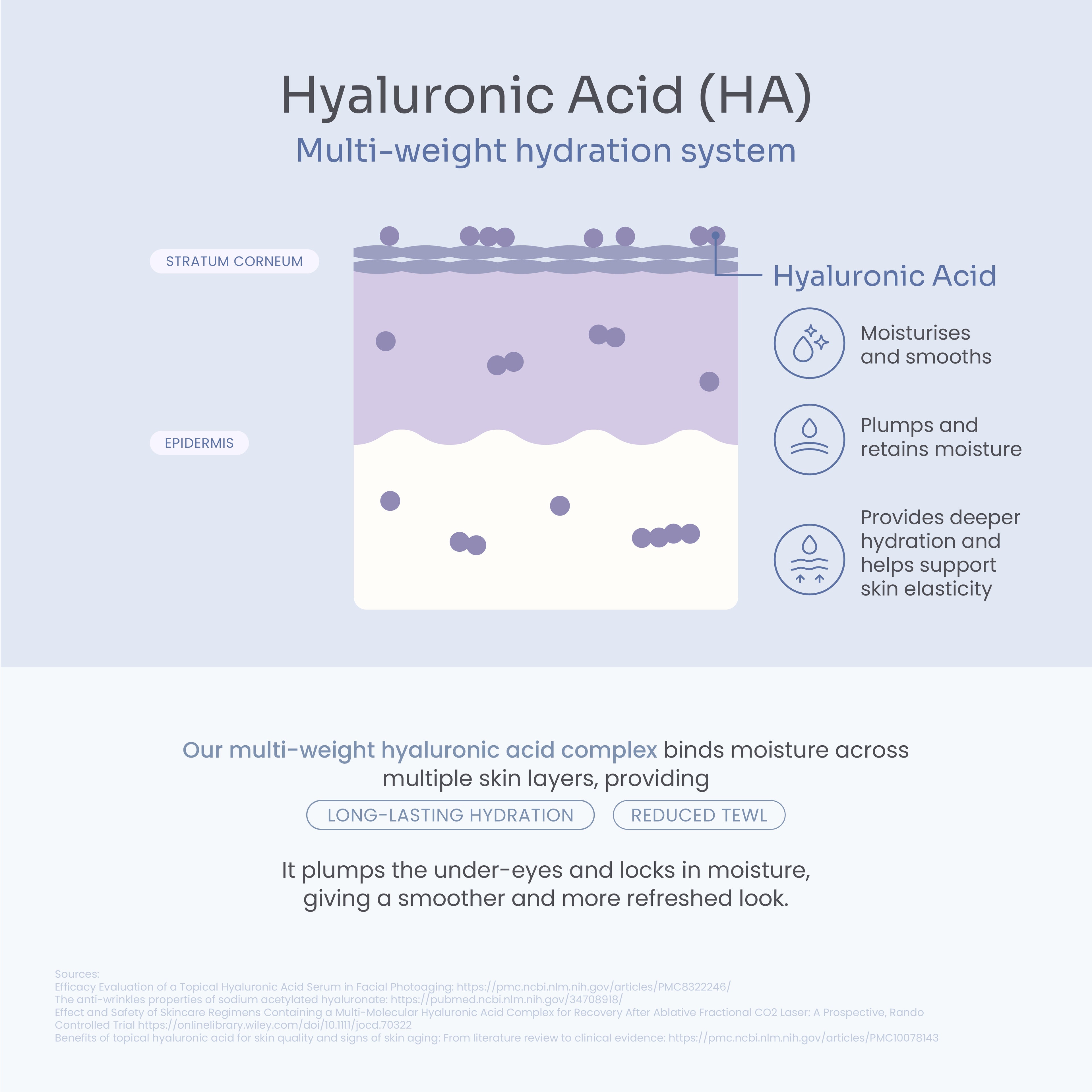 💧 7 Types of Hyaluronic Acid: A multi-weight hydration complex that penetrates different layers of the skin to plump fine lines from the inside out.
