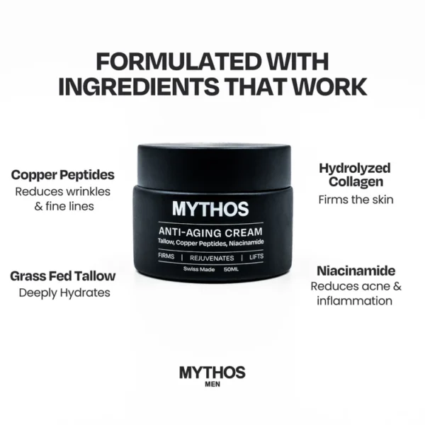 Most men’s skincare is filled with “forever chemicals” and hormone disruptors—not Mythos. Developed in Switzerland, where cosmetic standards are the strictest in the world (banning 1,300+ chemicals), Mythos Men is a powerhouse of longevity science. Featuring GHK-Cu (Copper Peptide), which outperforms Vitamin C and Retinol in collagen production, this cream targets fine lines, under-eye bags, and skin sagging almost instantly. With a base of Grass-Fed Tallow and Jojoba Oil, it mimics your skin’s natural oils for 24-hour hydration without ever feeling greasy.