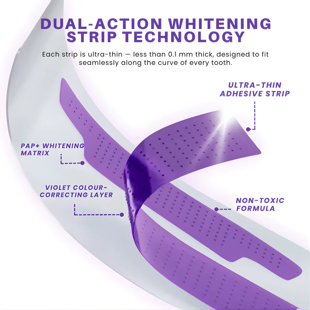 • Even-contact film: Cellulose gum, HPMC, and PVM/MA copolymer help the strip hug teeth for uniform results.
