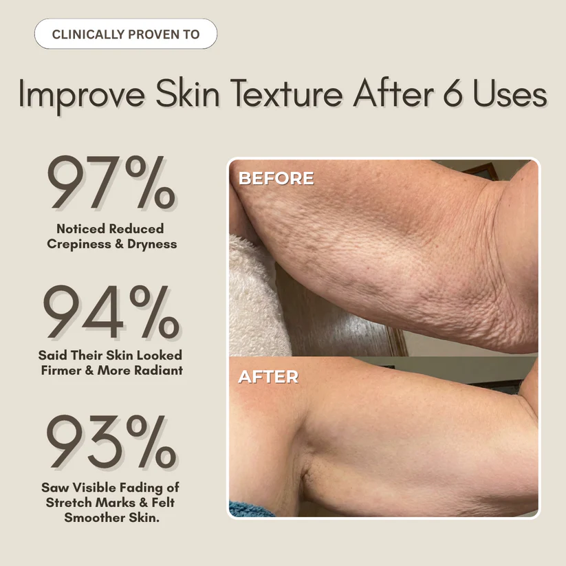 Days 22-30 (The Full Shift): Crepey textures soften, and stretch marks appear visibly diminished. Reach for those sleeveless tops with 100% confidence.